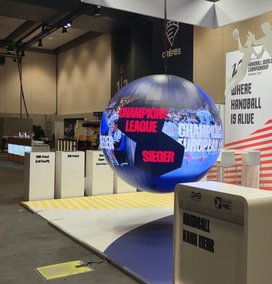 Derse übersetzte die Verbindung von Liga und Verband gestalterisch in eine gemeinsame Markenwelt. Die kreative Leitidee inszeniert Handball als dynamisches Ökosystem – emotional aufgeladen und technologisch vernetzt, als Plattform für Dialog und Kooperation. Die zentrale LED-Sphere mit zwei Metern Durchmesser fungiert dabei als immersives Zentrum und bringt Geschwindigkeit, Emotionalität und internationale Strahlkraft des Handballs räumlich auf den Punkt.